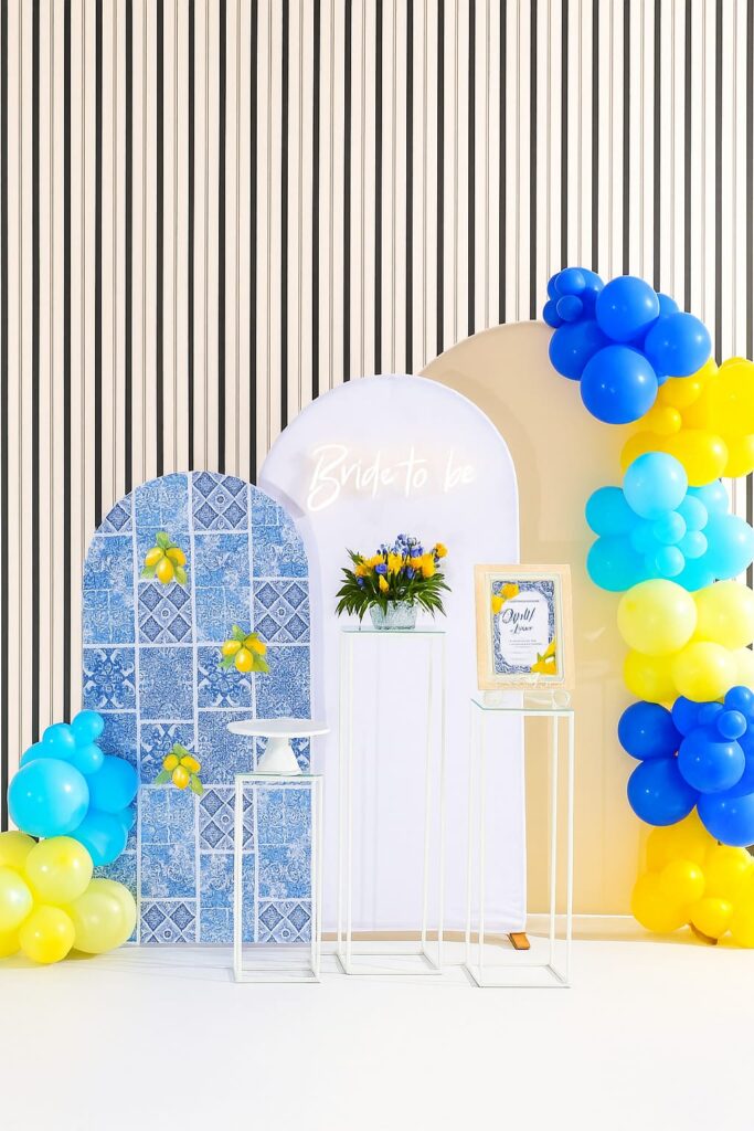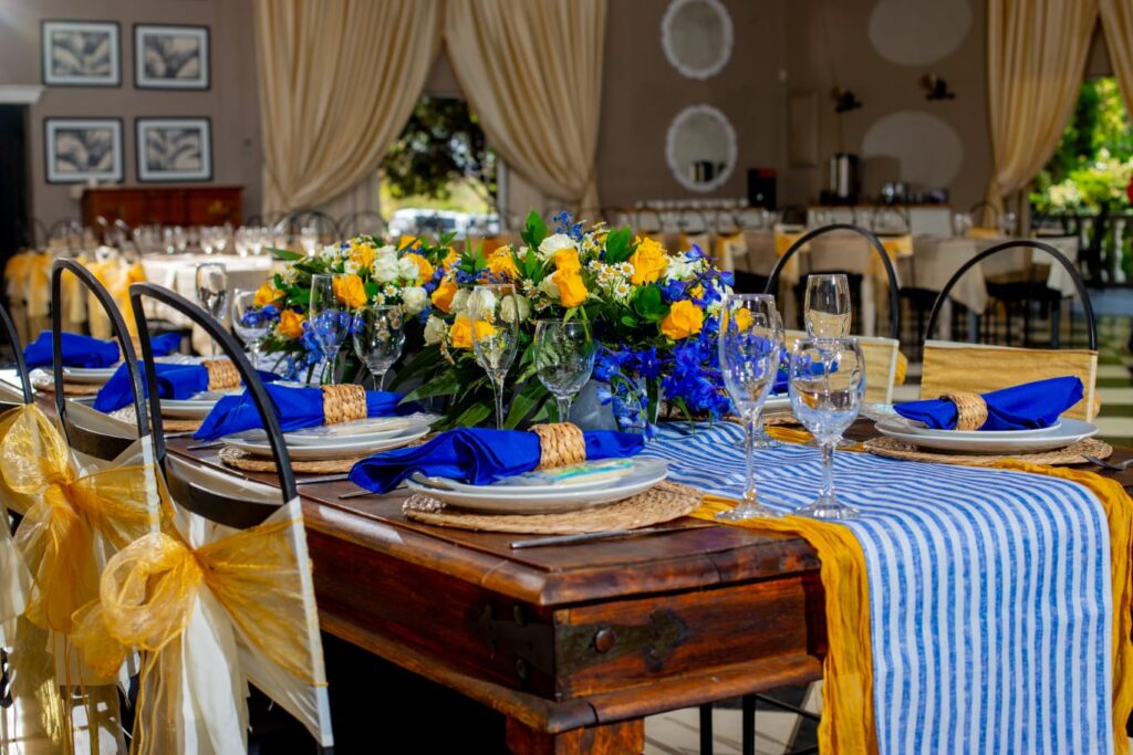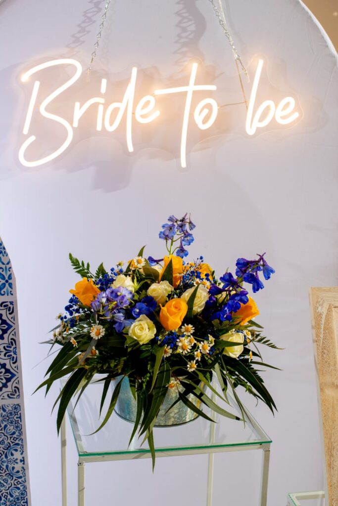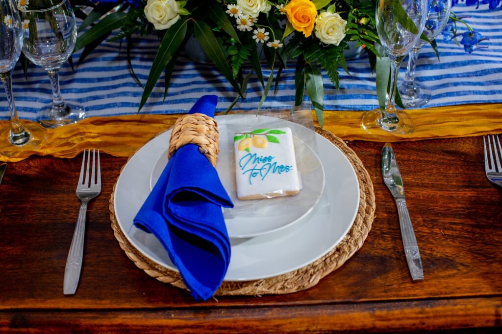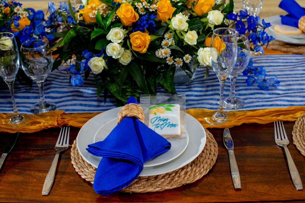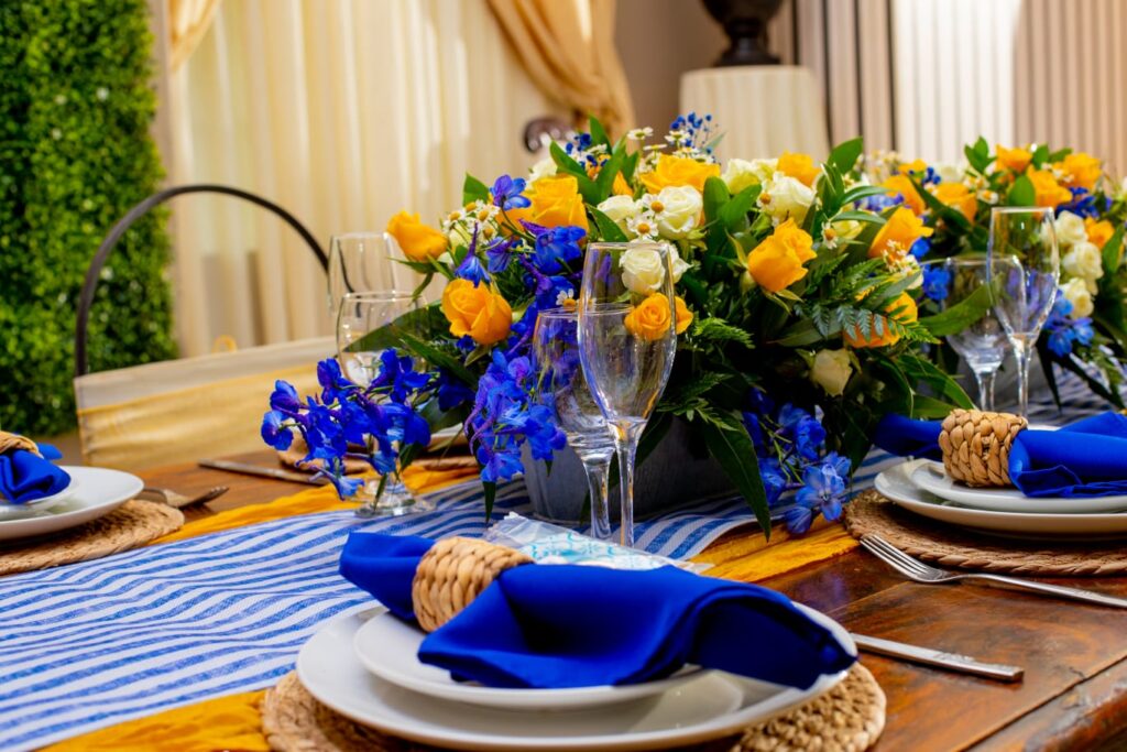 This vibrant Bride-to-Be table setting radiates joy, elegance, and celebration. Bold yellow and royal blue blooms take center stage, symbolizing happiness, confidence, and love — the perfect combination for honoring a beautiful bride. The floral arrangements bring lively color and sophistication to the rustic wooden table, while soft draping and golden accents add a touch of luxury. Every detail is designed to capture the excitement of new beginnings and the beauty of the moment.