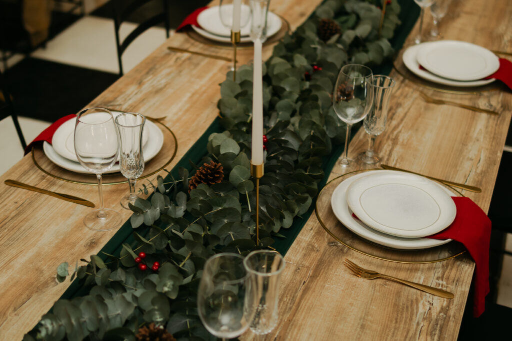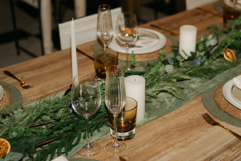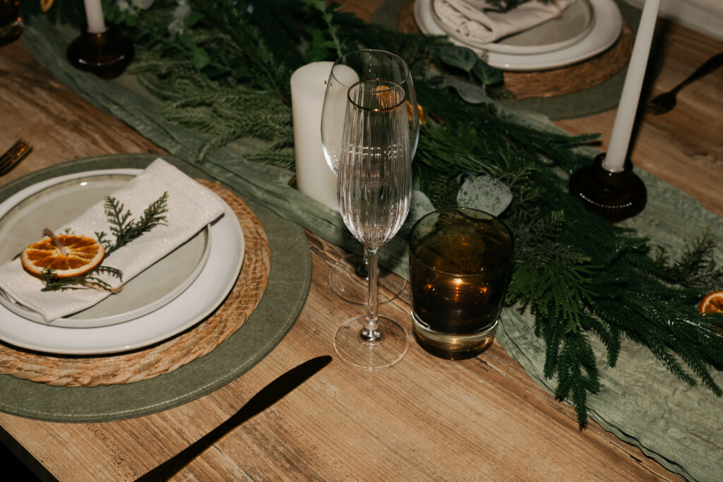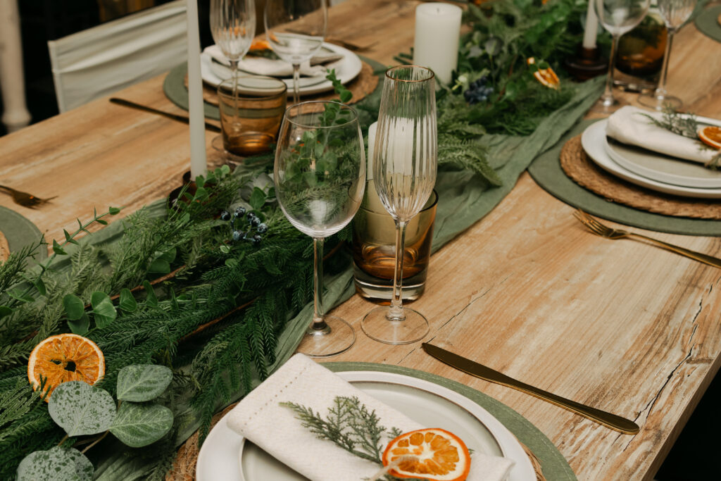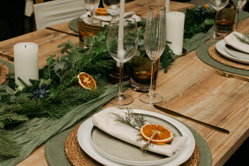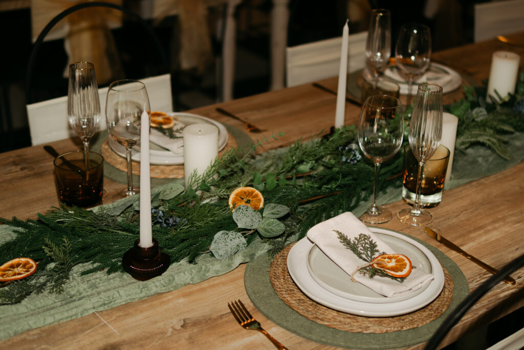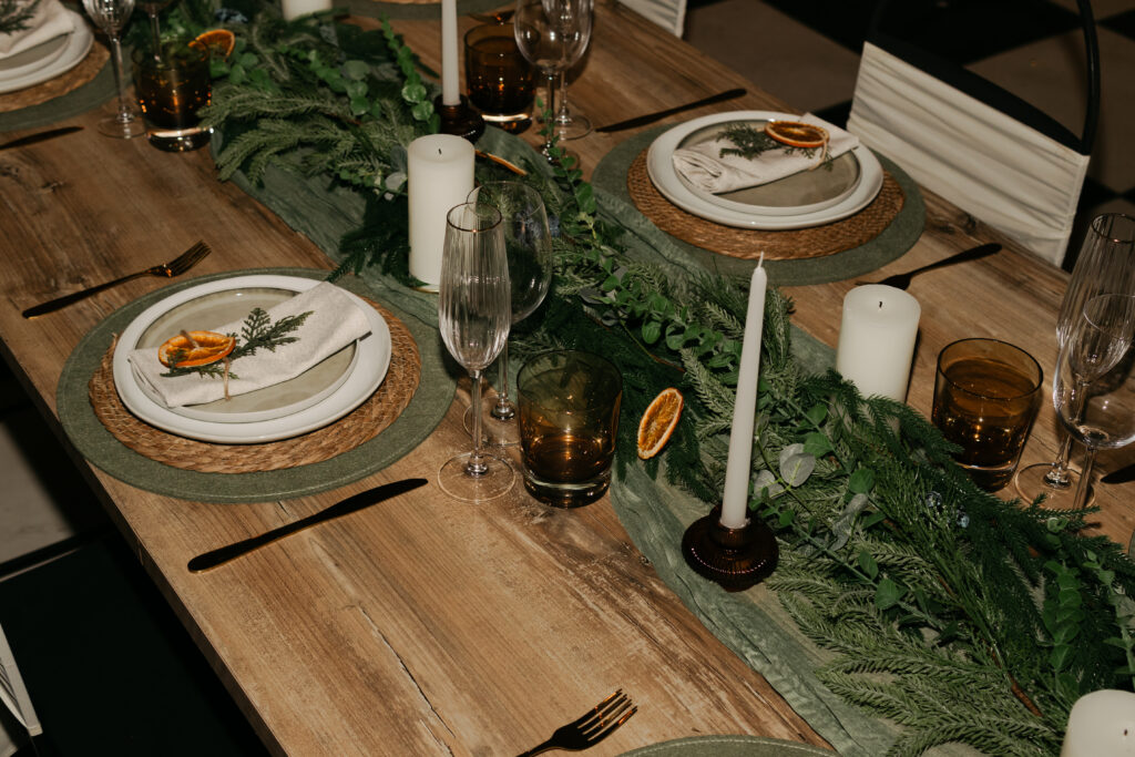 This Christmas tablescape blends earthy elegance with seasonal charm. A lush evergreen garland with eucalyptus, berries, and dried orange slices runs down the centre, paired with warm candlelight for a cozy holiday glow. Layered place settings, woven textures, and gold cutlery complete the look—perfect for relaxed yet beautifully styled Christmas celebrations.