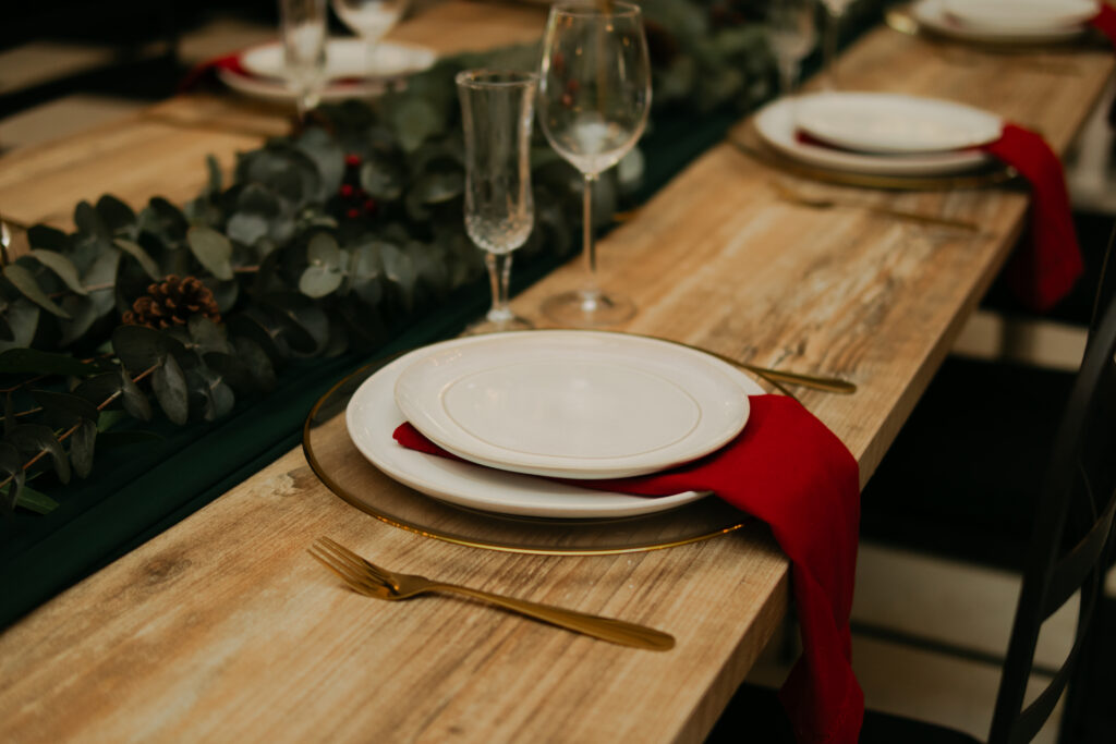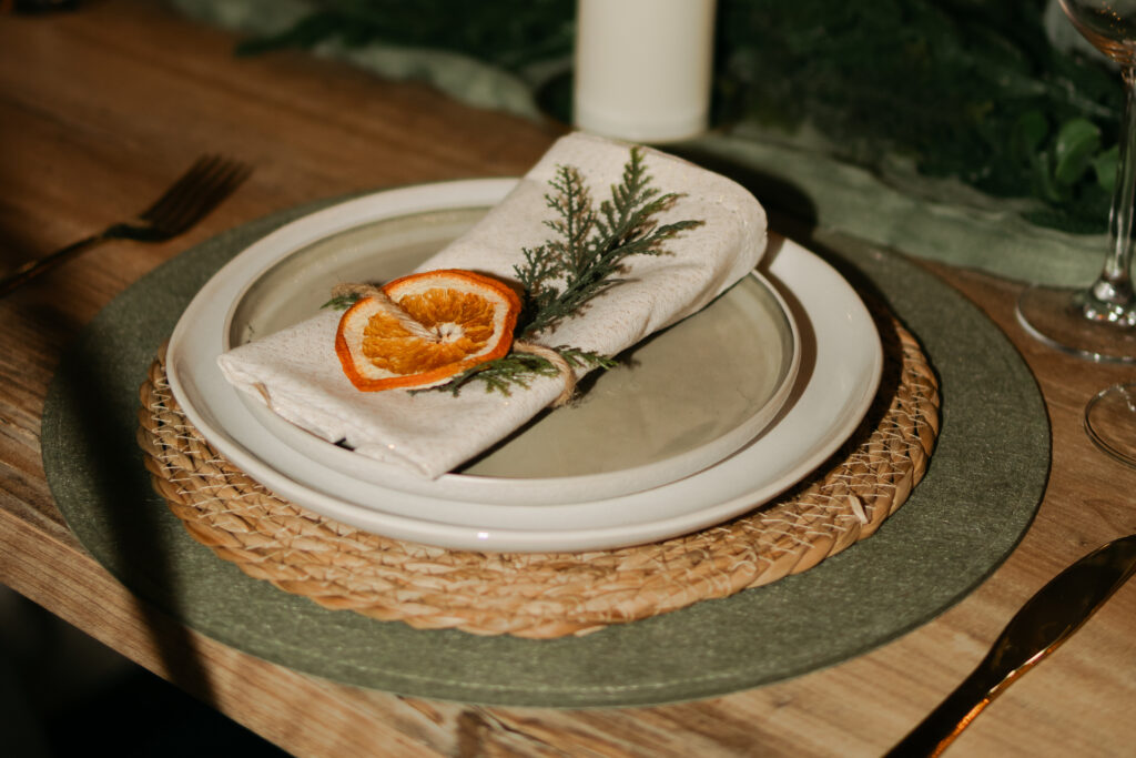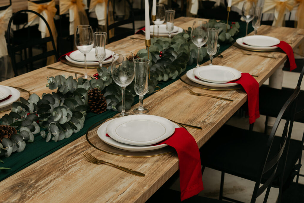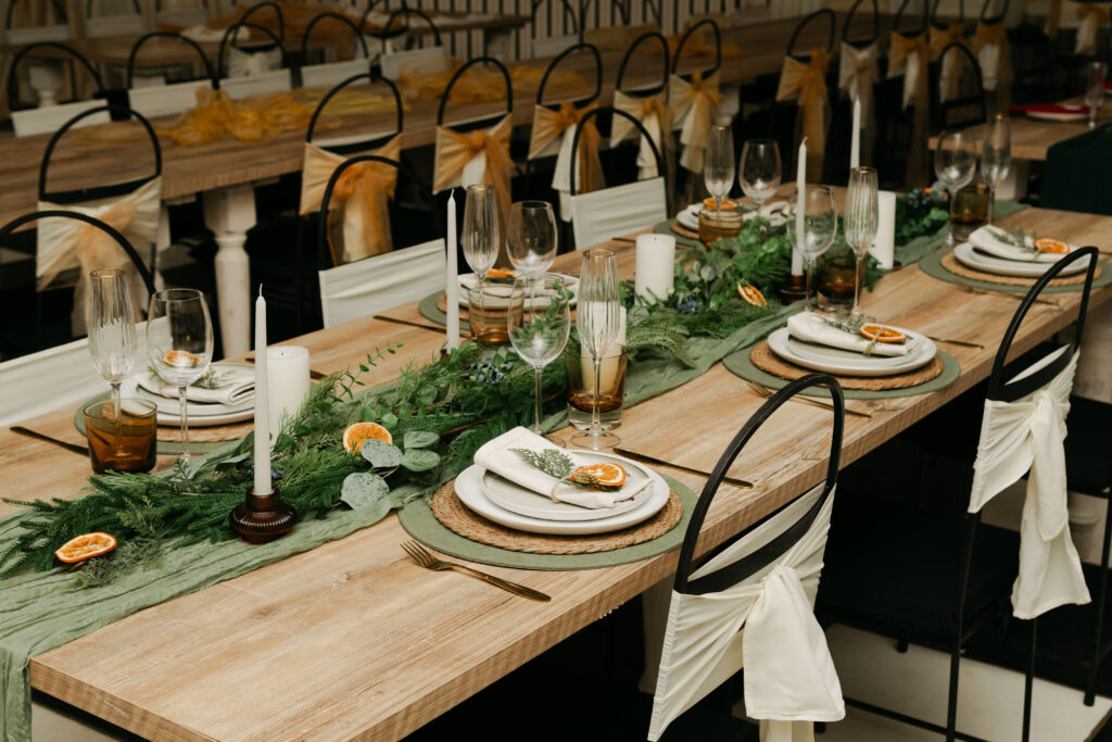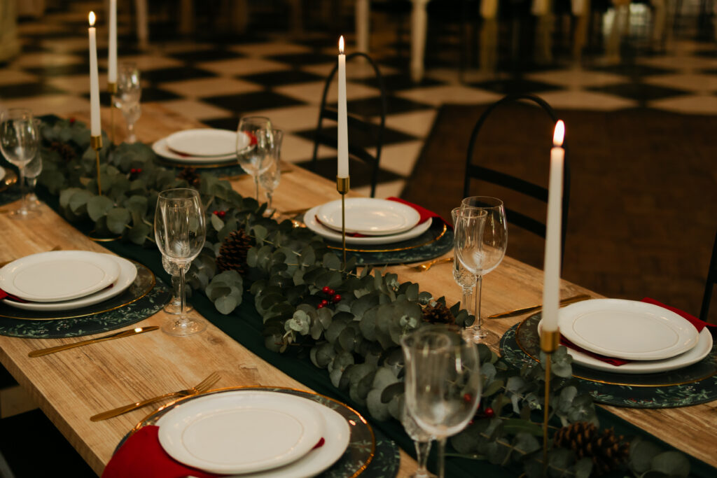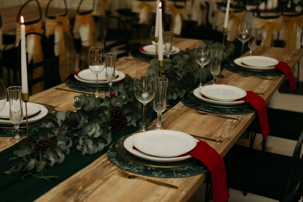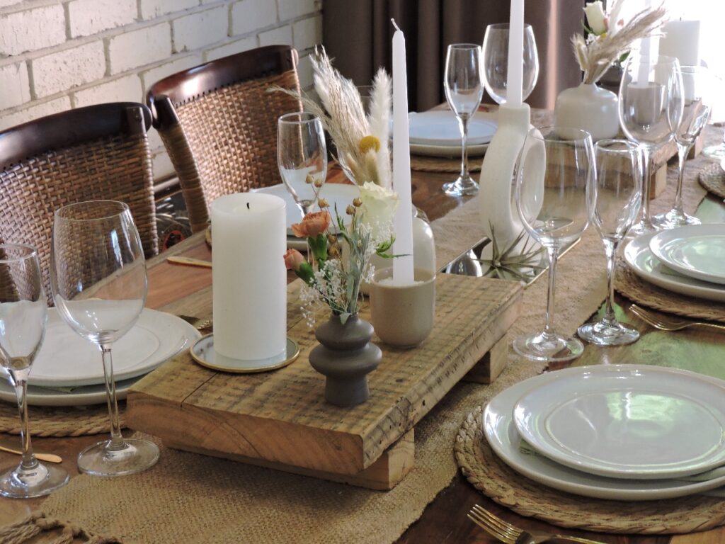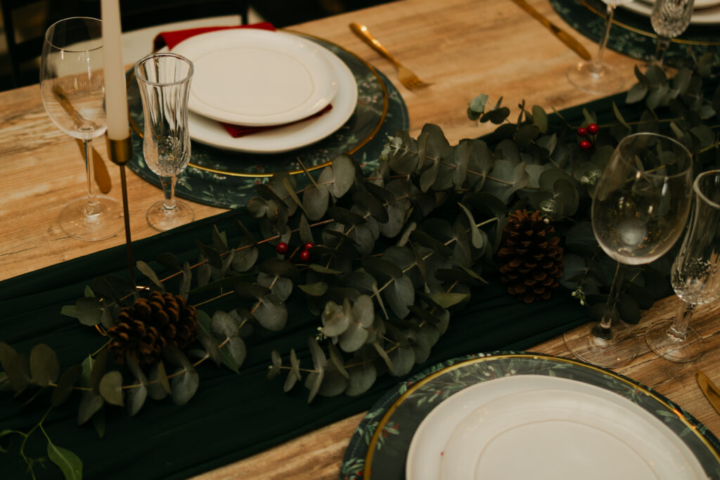 This Christmas tablescape blends earthy elegance with seasonal charm. A lush evergreen garland with eucalyptus, berries, and dried orange slices runs down the centre, paired with warm candlelight for a cozy holiday glow. Layered place settings, woven textures, and gold cutlery complete the look—perfect for relaxed yet beautifully styled Christmas celebrations.