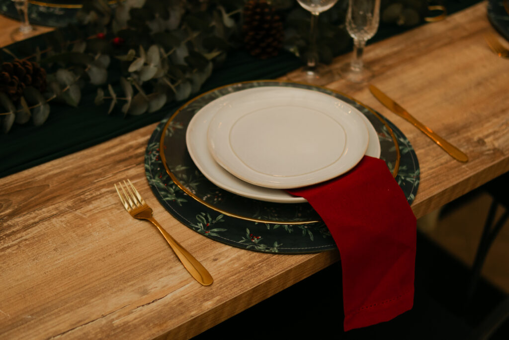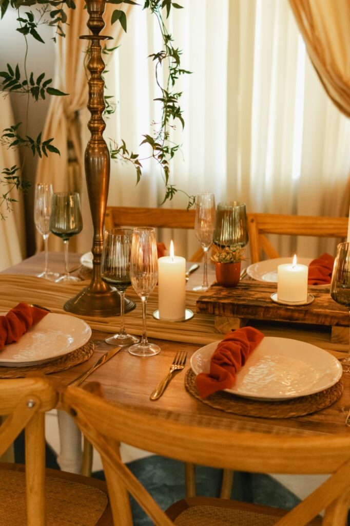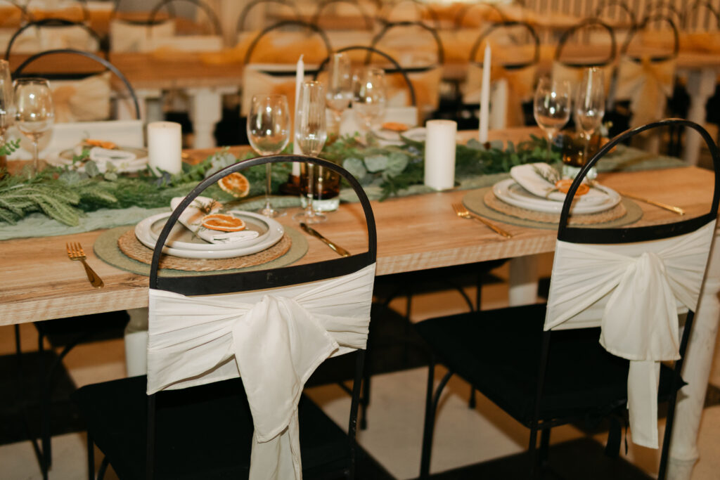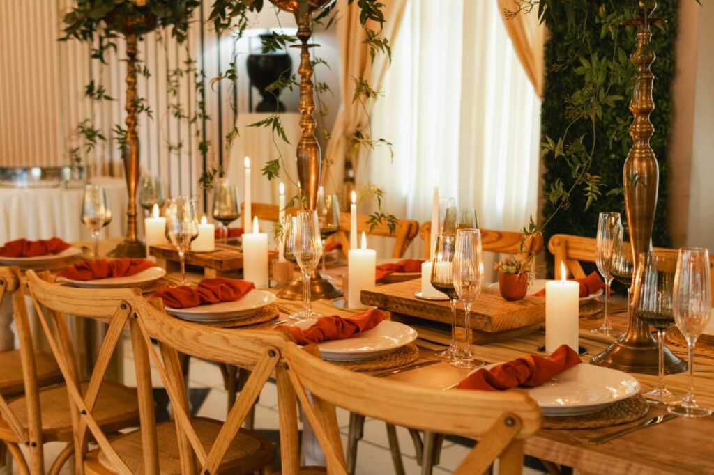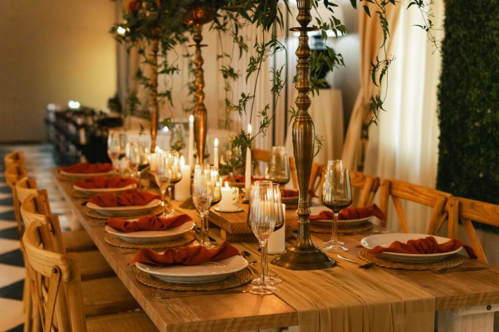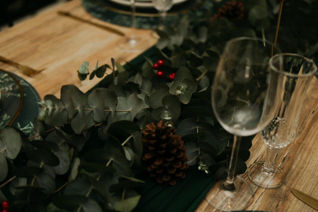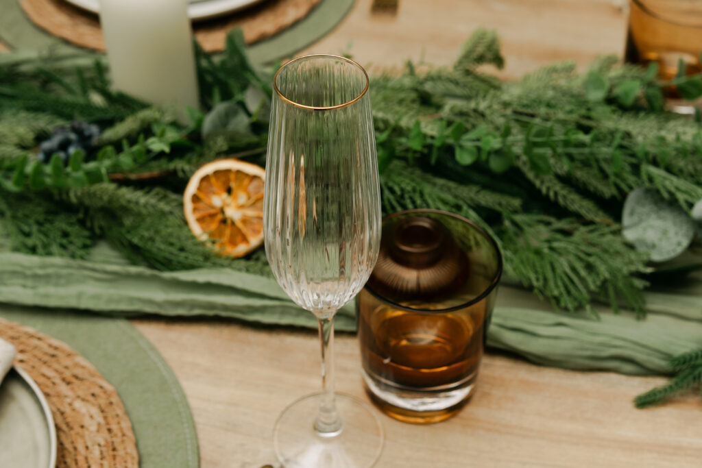 This Christmas tablescape blends earthy elegance with seasonal charm. A lush evergreen garland with eucalyptus, berries, and dried orange slices runs down the centre, paired with warm candlelight for a cozy holiday glow. Layered place settings, woven textures, and gold cutlery complete the look—perfect for relaxed yet beautifully styled Christmas celebrations.