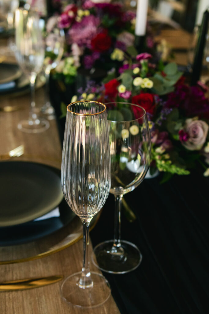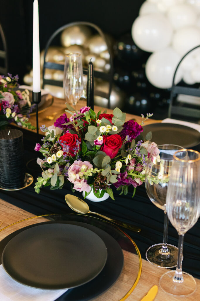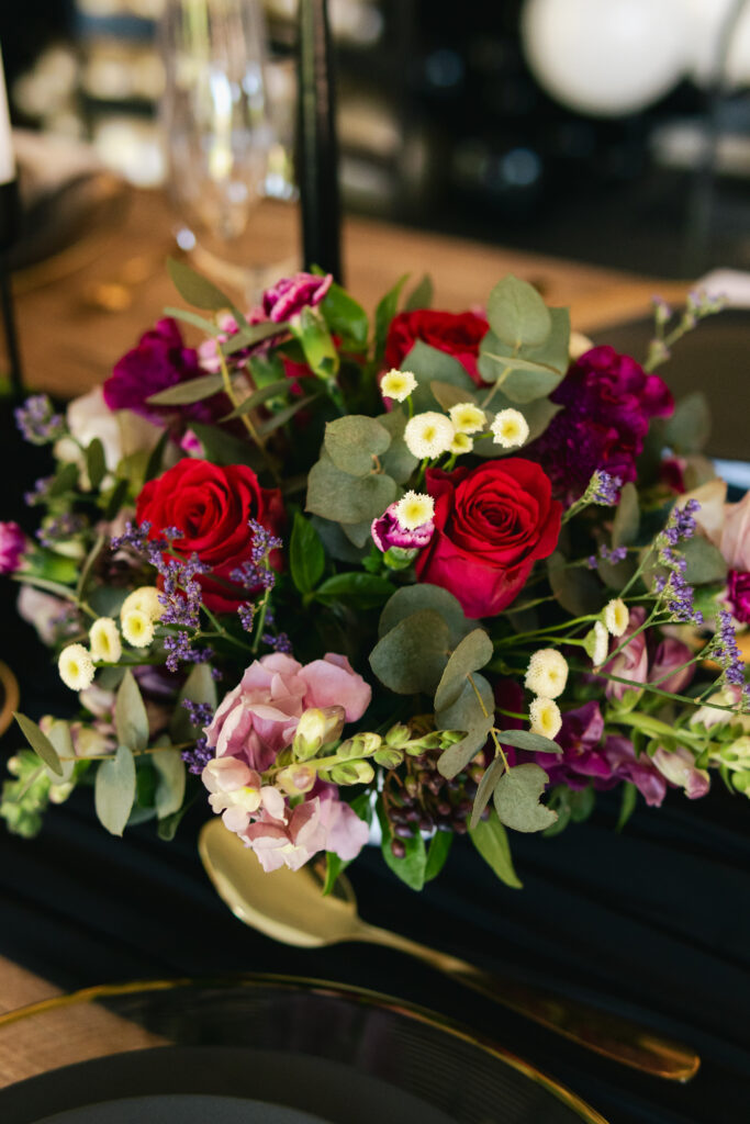 Lush floral arrangements featuring deep burgundy roses, mauve chrysanthemums, lavender lisianthus and delicate creamy accents bring texture and vibrancy to the table. The bold florals are beautifully contrasted with sleek black taper candles and gold-rimmed glassware, adding a touch of glamour and drama to the overall design.